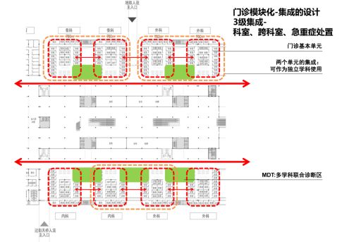 提升護理效率、共享物資供應、方便協(xié)調(diào)護理人員配置及夜間管理——采用以中央辦理大廳為核心的模塊化布局方式,門診采用科室、跨科室、急重癥處置三級集成的模塊化設計,住院采用四個護理單元集成的護理層。