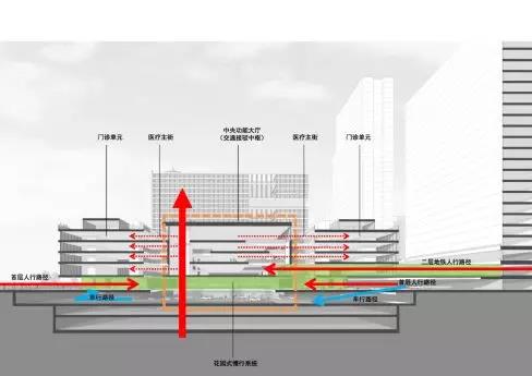 以往我們?nèi)メt(yī)院,都是去一個正門大廳,然后從大廳再去各個科室,這往往讓大廳成為人流的瓶頸。而在新華醫(yī)院,預計每天人流量有4萬人,因此把醫(yī)院打造成從四面八方都能進入的場所。